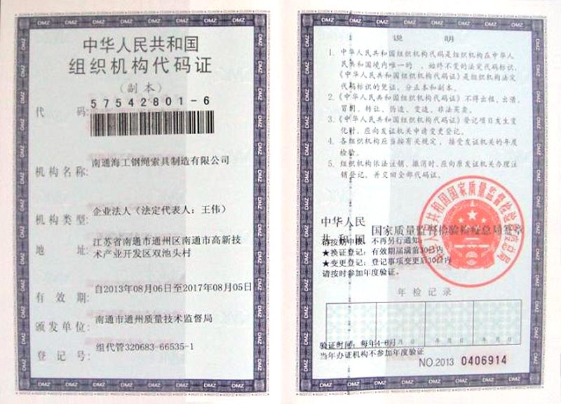 公司臥薪嘗膽,歷經(jīng)數(shù)十年發(fā)展,資金力量深厚、生產(chǎn)設備齊全、生產(chǎn)能力完善,擁有5000噸自動壓套機和2000噸臥式拉力試驗機。同時,我們擁有二十余年的鋼繩索具生產(chǎn)經(jīng)營的豐富經(jīng)驗,而且歷經(jīng)不斷的創(chuàng)新與發(fā)展,已經(jīng)培養(yǎng)和吸納了一批生產(chǎn)、制造鋼繩索具的優(yōu)秀人才,已發(fā)展成為集研發(fā)、生產(chǎn)、檢測及銷售為一體的鋼繩索具設備制造公司。目前公司已經(jīng)通過ISO9001:2000質(zhì)量體系認證,中國船級社CCS工廠認證,中國質(zhì)量保障中心CQGC證書,并可出具CCS、ABS、LR、BV、DHV、GL等船級社相關(guān)證書,生產(chǎn)中嚴格執(zhí)行ISO7531,8792,8793國際標準和GB/T6946-2008國家標準及其他相關(guān)標準,公司研發(fā)生產(chǎn)的產(chǎn)品已經(jīng)發(fā)展到鋼繩制品和索具、軟索吊帶、起重設備、索具配件等五大類。